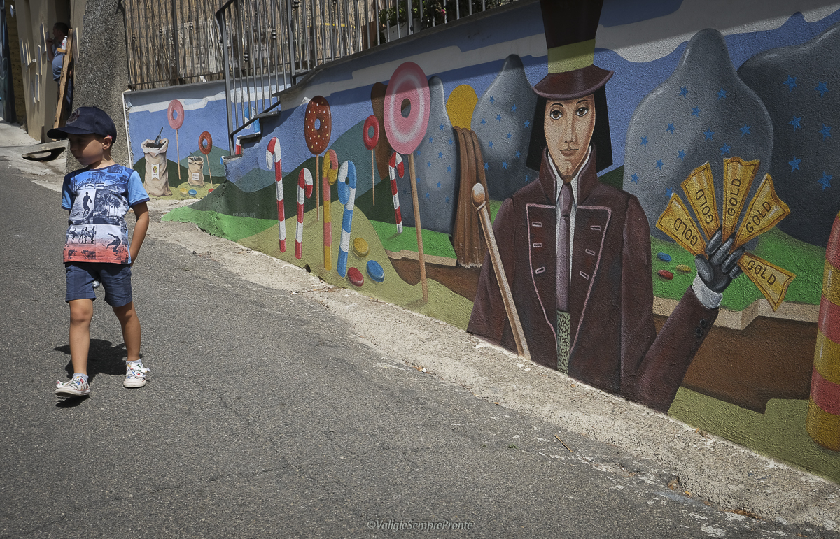 Proseguendo verso il centro di Sant’angelo incontriamo un murales che ci conquista subito…La Fabbrica di cioccolato di Willy Wonka!!! A chi non verrebbe voglia di farci un salto dentro?